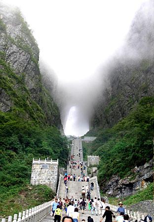 選擇乘索道游覽天門山是最佳視角。索道吊廂一出站房,馬上就騰空飛了起來,從城市的一棟棟樓頂掠過,猶如在城市上空滑翔。翻過一道山梁之后,城市被遠(yuǎn)遠(yuǎn)拋在了視線以外,大片翠綠的稻田映入眼簾,透過打開的通風(fēng)窗口,一陣陣青草水田特有的清香沁入心脾。或高或低的農(nóng)舍不時(shí)從我們身下滑過,牛羊們?nèi)齼蓛捎崎e的在田間浮動(dòng)著,靜謐、安詳。再翻過一座山峰,我們便立即被滿山的青翠所包圍,萬仞絕壁也已投懷送抱。索道支架矗立于絕壁天險(xiǎn)中,或挺立或傾倒或探頭或擁抱,我們繼續(xù)在艱險(xiǎn)中游歷,時(shí)而隱沒于云堆,時(shí)而出世于蒼穹。這時(shí)你除了那滿懷的驚險(xiǎn)刺激外有的便只有望索而興嘆了。我拍了很多片子,但是總覺得還是沒有足以記錄下來這座空中盆景的壯麗。