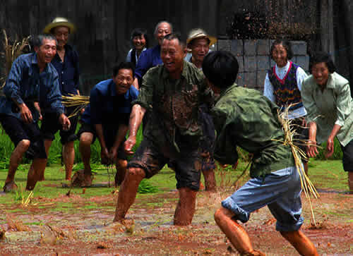 插秧活動(dòng)的最后一天,叫做“關(guān)秧門”。一丘田里,聚集了很多幫忙插秧的人,大家心里都憋著一股勁,看誰(shuí)秧插得最快。速度慢人往往會(huì)被插得快的人圍住,最后關(guān)在秧田中間出不來,這叫“關(guān)豬籠”。這時(shí)候,速度快的人就會(huì)走上田埂,抓起稀泥團(tuán)朝被關(guān)了豬籠的人扔去,也有專門砸主人一身稀泥的,岸上也有人澆水。主人身上被砸的稀泥越多,主人越高興。在關(guān)秧門的最后時(shí)刻,人們會(huì)在田野里上演一場(chǎng)你追我趕的游戲,土家人把它叫做“糊倉(cāng)”。在“糊倉(cāng)”的過程中,誰(shuí)也不會(huì)記仇,大家你追我趕,場(chǎng)面極其熱鬧。