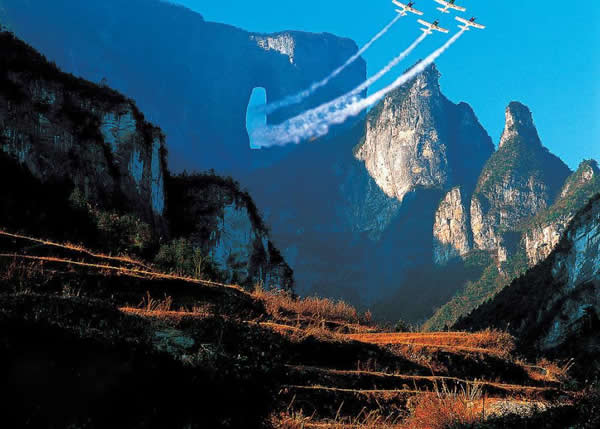 1700多年來,這一道奇絕天下的勝景吸引著無數(shù)的探訪者趨之若鶩。特別是在1999年,世界特技飛行大師駕機(jī)穿越天門洞,在全球引發(fā)了轟動(dòng)效應(yīng),收看現(xiàn)場(chǎng)直播的觀眾達(dá)到8億之多。