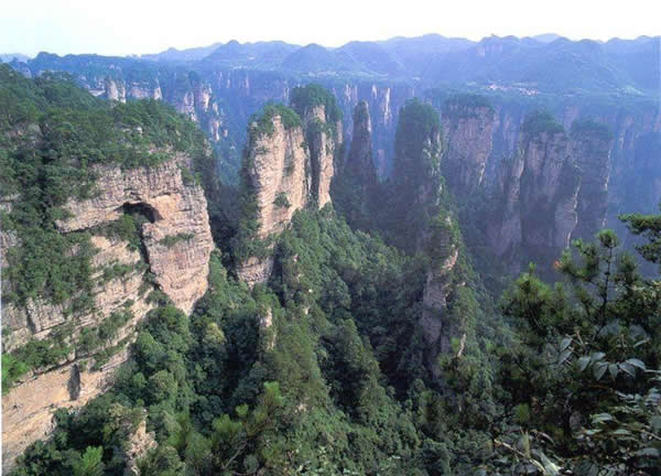 這就是大觀臺。極日遠眺,千百座奇峰盡收眼底。一位詩人說,武陵源的砂巖石峰是一步一觀景,千步千造型,一山有四季,十步不同大。專家測算出武陵源石峰有3103座。一如一位高超的雕塑大師,模擬宇宙萬物,無不形態(tài)逼真,維妙維肖,栩栩如生,呼之欲動。有的如海螺出水,有的如金龜銜日,有的如蓮花盛開,有的如天橋橫空,有的如長槍刺大,有的如寶塔聳立,有的如老人采藥,有的如玉女梳妝,有的如將軍出征,有的如戰(zhàn)馬長嘯,有的如情人幽會,有的如夫妻相擁,有的如仙女散花,有的如村姑守望……有的孤峰獨秀,有的直插云霄,有的婷婷玉立,有的威武勇猛,有的小巧玲瓏,有的大氣磅礴。進入武陵源,但見一片峰的森林,峰的世界,峰的海洋。挺拔、奇秀、集中、原始、粗獷、古野。這就是武陵源。 一位藝術大師說:武陵源的山峰,改寫了山的概念。大攝影家陳勃說 :“三山五岳堪比美,華夏風光第一流!蓖趵^杰先生說:“武陵源上二日游,勝讀千篇李杜詩!痹S世杰先生說:“秀幽險峻稱奇絕,五岳黃山拜·卜風!崩畛扇鹣壬鸀榇舜蟊Р黄剑骸吧裰輨倬罢l為最?須請霞公重評勘!笨上煜伎蜔o緣到大觀臺來,也不可能為武陵源作甚評價了。