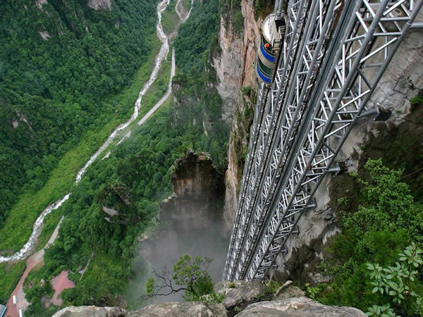 百龍電梯位于世界自然遺產(chǎn)張家界武陵源風(fēng)景區(qū)。工程分布在4.5公里,垂直高差385米的核心景區(qū)。電梯運(yùn)行高度326米,主體由154米山體豎井和172米貼山鋼結(jié)構(gòu)井架等組成,采用三臺(tái)雙層全暴露觀光電梯并列分體運(yùn)行。是連通森林公園、金鞭溪、水繞四門到袁家界、烏龍寨、天子山的重要觀光交通設(shè)施。百龍?zhí)焯莨こ毯陚ァ⒐に噺?fù)雜,施工驚險(xiǎn),堪稱“世界工程奇觀”。它的建成創(chuàng)造了三項(xiàng)基尼斯世界紀(jì)錄。