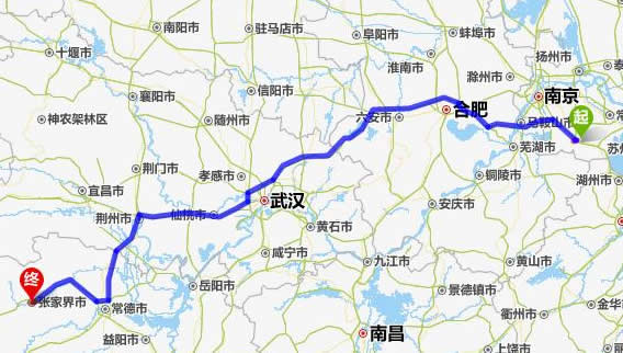 左右,沿途經過溧陽市——馬鞍山市——合肥——六安市——麻城市——仙桃市——潛江市——荊州市——常德市(這里可以不走常德,直接從荊州經澧縣、石門縣到慈利縣)——慈利縣——張家界。
