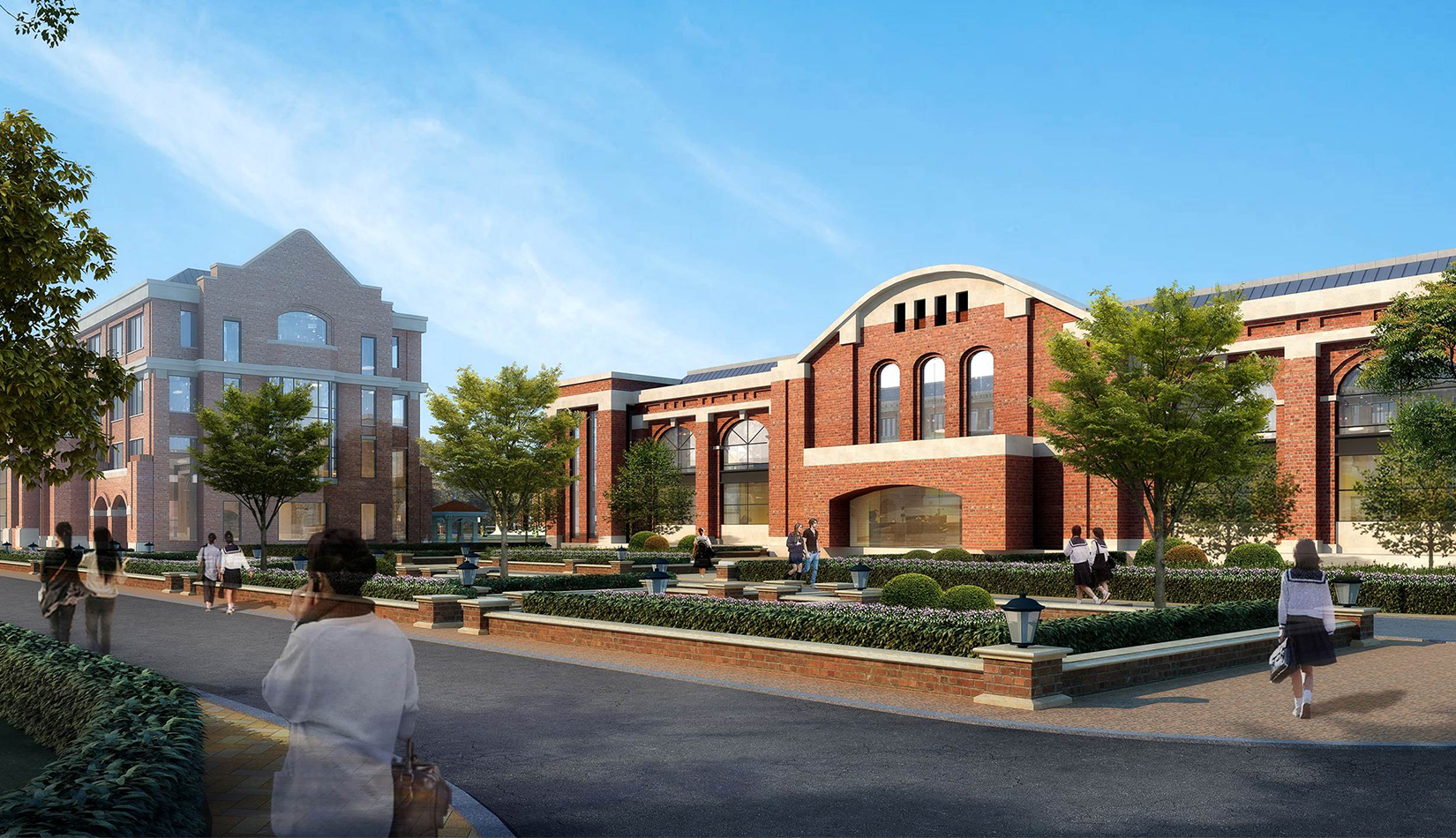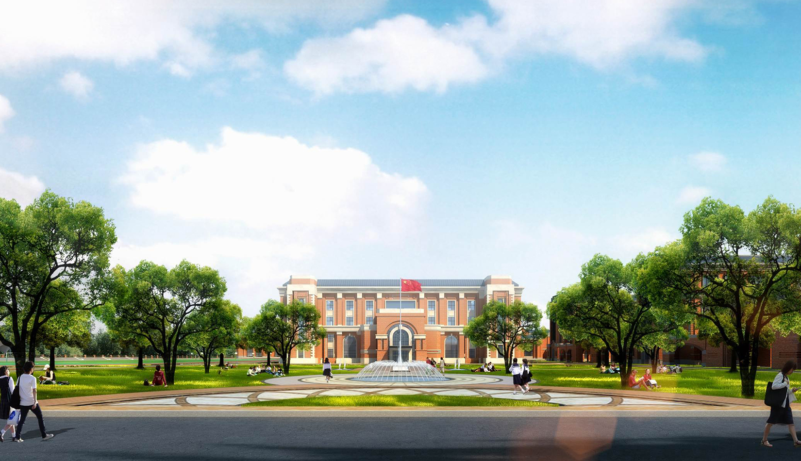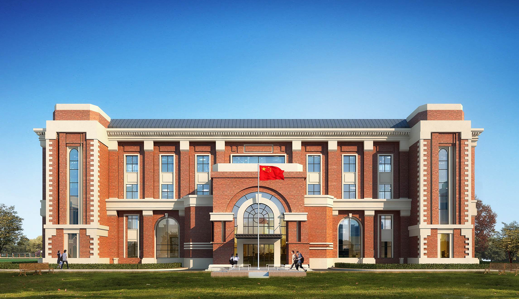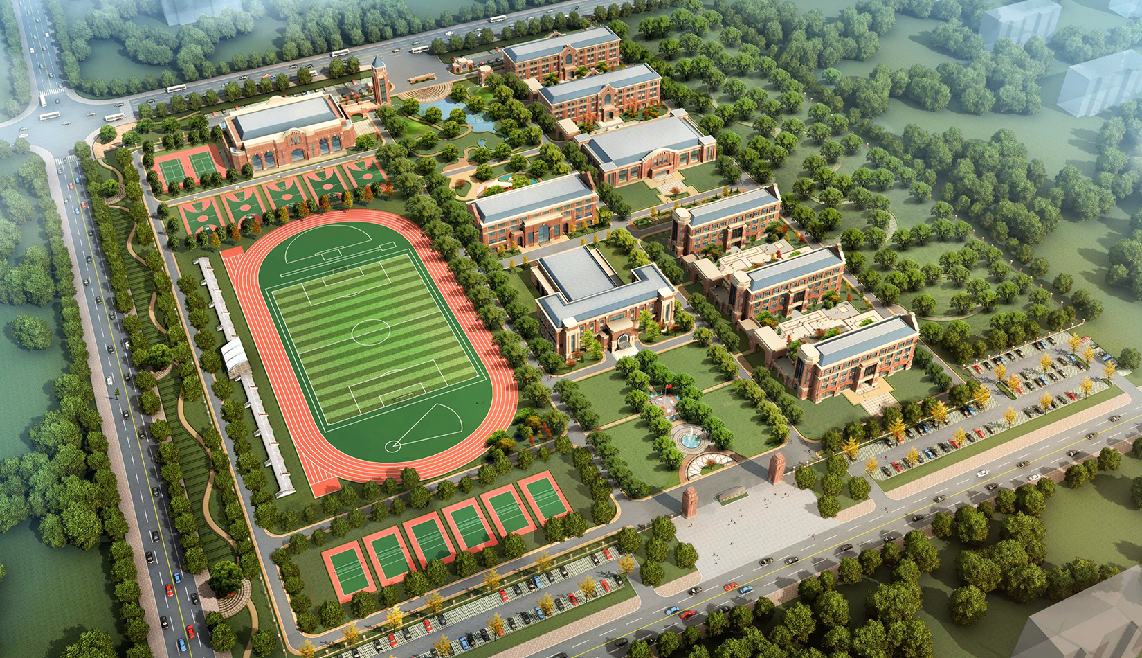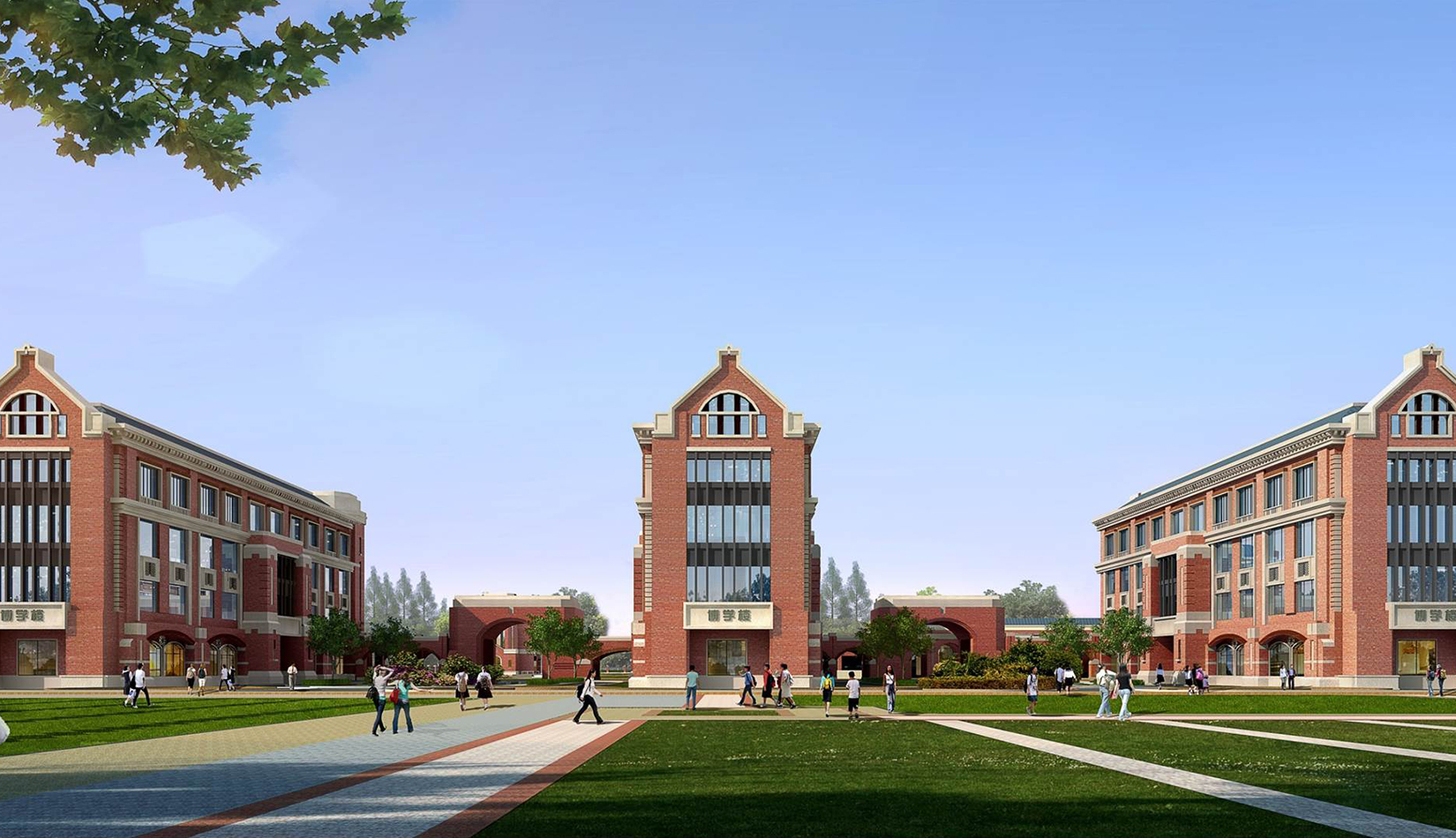 分區(qū)設(shè)計(jì)上,采用了“前場(chǎng)后園”的設(shè)計(jì)手法。前區(qū)以教學(xué)區(qū)為主,圍繞中心圖書(shū)綜合樓形成前區(qū)禮儀性廣場(chǎng),同時(shí)以中軸對(duì)稱為原則,體現(xiàn)了教學(xué)的嚴(yán)肅性與秩序性;各個(gè)教學(xué)單元以年級(jí)、功能就近布置為基本原則,以中國(guó)傳統(tǒng)的“院落”形式進(jìn)行組合,后院生活區(qū)借鑒了“山水園林”的布局手法,結(jié)合中心景觀,進(jìn)行自由化布局,達(dá)到景入園中、人在景中生活場(chǎng)景,使學(xué)生在學(xué)習(xí)之余,得到充分的放松。