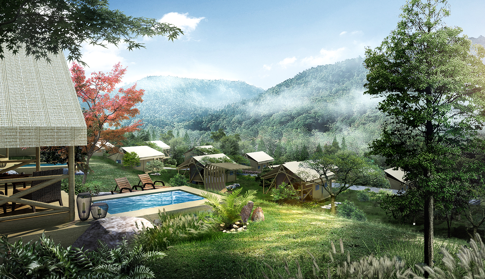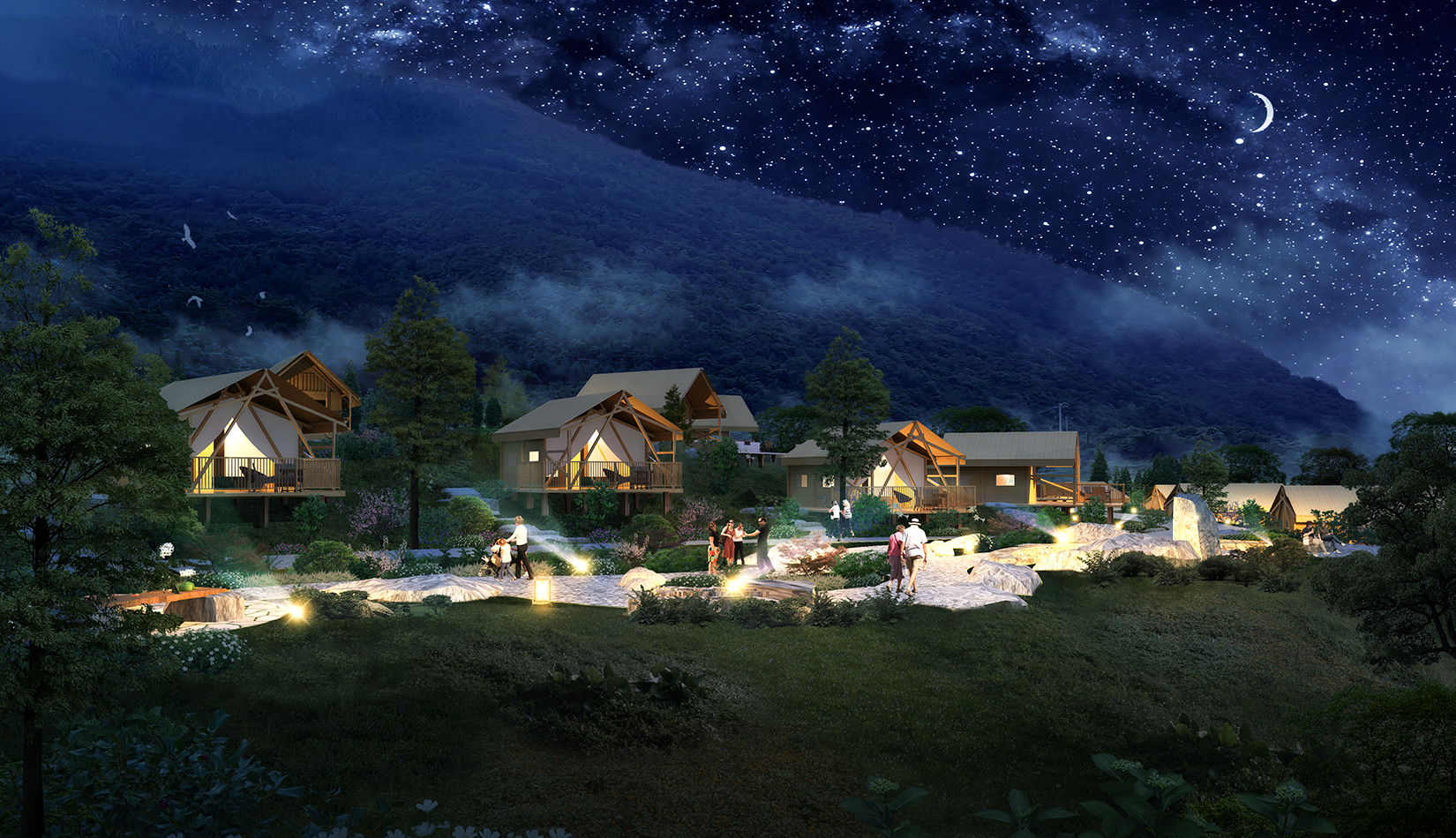根據(jù)基地的地勢分布及功能需求,空間結(jié)構(gòu)上分為“一帶兩軸三核心五組團(tuán)”。建筑設(shè)計的五個組團(tuán),分別是濱水休閑組團(tuán)、水畔風(fēng)光帳篷組團(tuán)、高端養(yǎng)心帳篷組團(tuán)、中心服務(wù)組團(tuán)及山居野趣帳篷組團(tuán)。客房部分采用帳篷度假屋的方式,凸顯野奢度假的浪漫形式。