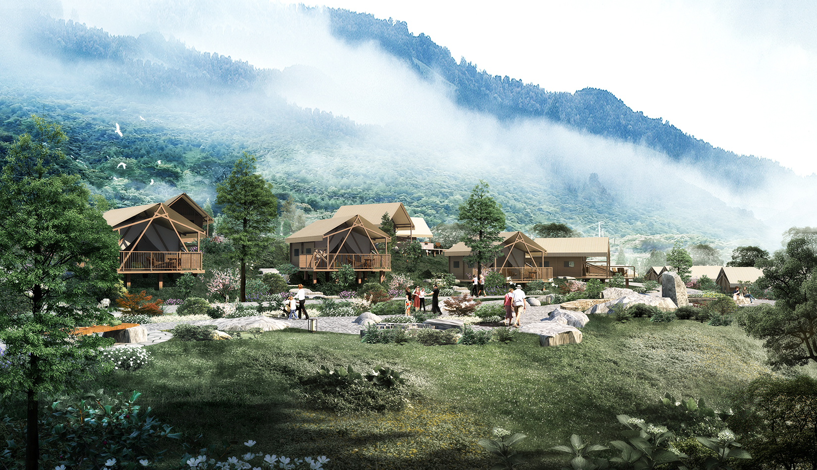景觀設(shè)計從野奢度假酒店的“野”和“奢”兩字入手,融入荒野生態(tài)的設(shè)計理念,又要與場地相融合、與原生態(tài)相映、與當(dāng)?shù)氐拿袼罪L(fēng)情相交匯,突出當(dāng)?shù)氐奈幕黝},強調(diào)高品質(zhì)的自然、野奢度假,從而打造出一個具備個性與特色,使游客能夠享受到自然野趣體驗的景觀環(huán)境。