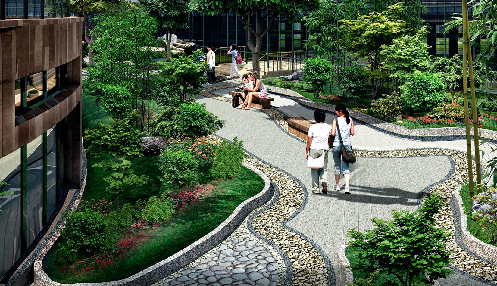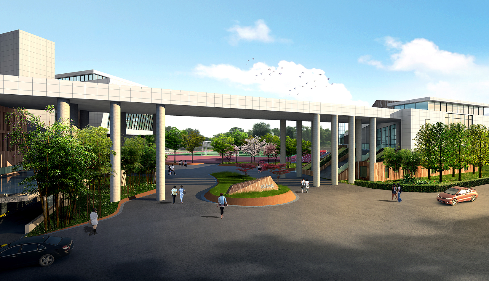1. 將抽象化的鳳翎設(shè)計成特色種植,結(jié)合建筑形態(tài)配以流線型鋪裝設(shè)計,在鋪裝上增加鳳凰島中學校訓校風的細節(jié)設(shè)計,凸顯學校濃郁的文化氛圍以及室外景觀環(huán)境的精致。