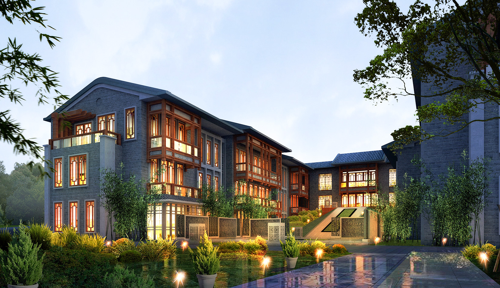 建筑造型采用中國古典建筑形式,立面符號(hào)提煉古典的建筑符號(hào),努力營造出中國傳統(tǒng)私塾的學(xué)院派的風(fēng)格。