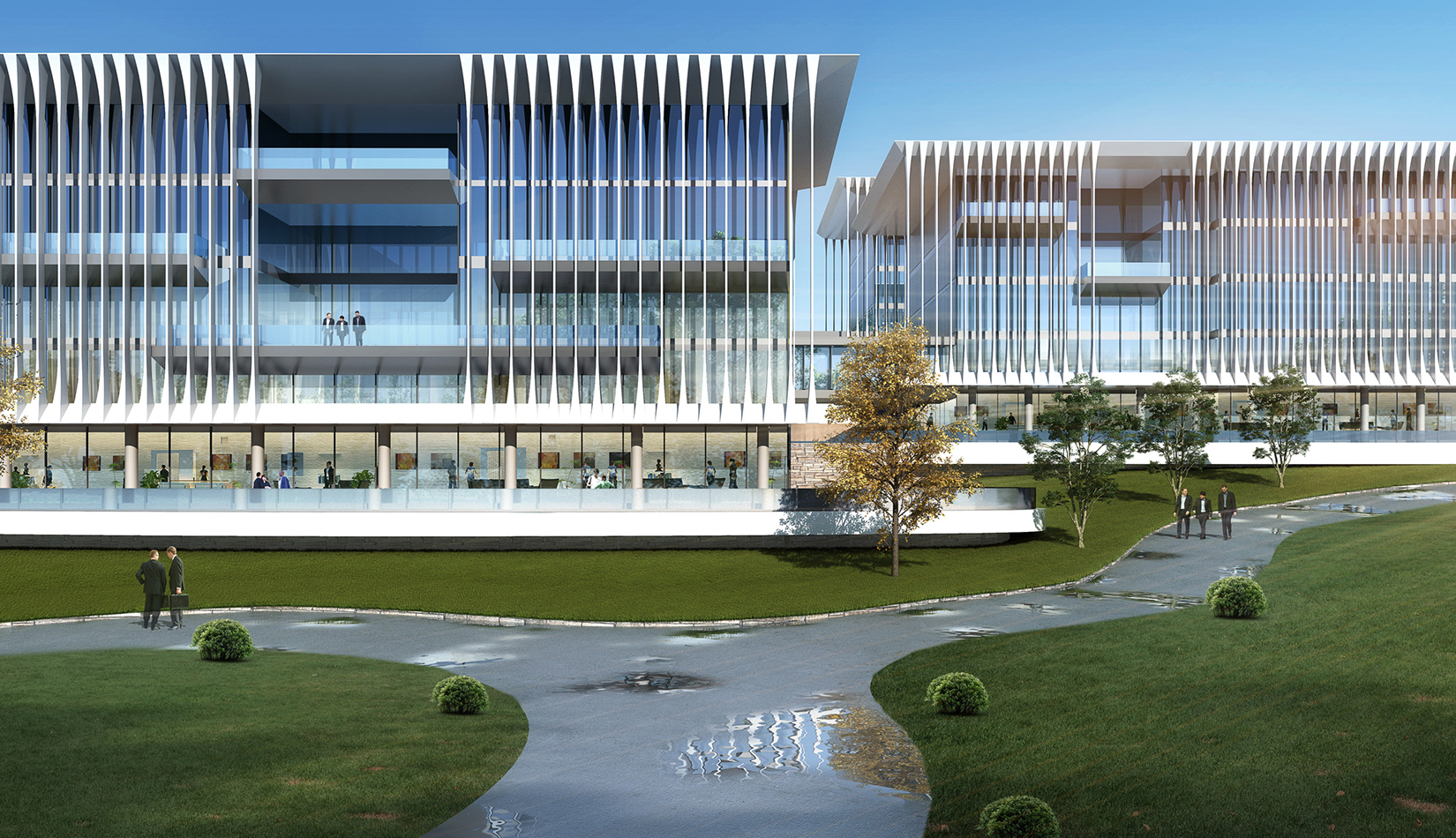 簡(jiǎn)潔大氣的豎向橫向劃分,使MECS主樓充滿海洋氣息;白色流線型屋頂順應(yīng)地勢(shì),自由舒展。流線型的體塊靠近海岸線,表達(dá)科研人員的探索精神,并且與地勢(shì)相結(jié)合。