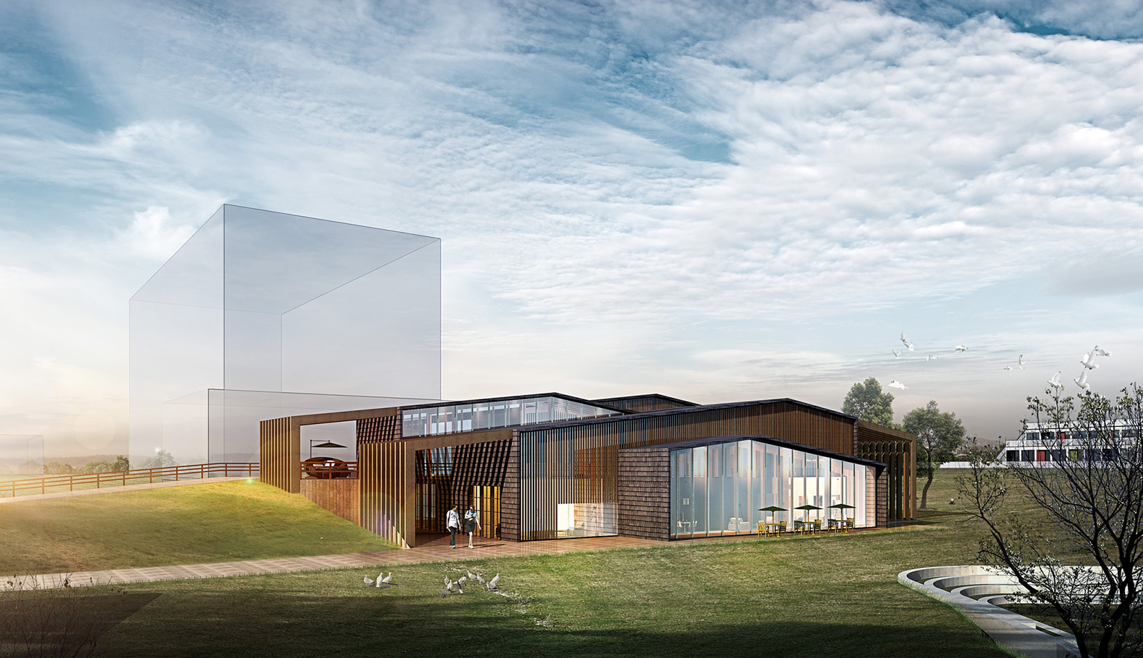 項目選址位于“中德創(chuàng)意設計 D-ZONE”地塊中,天然的谷地和水流,以草地為主。 考慮到周邊建筑及環(huán)境,確定了交錯的疊合的取景形式,致力于增加觀景表面積將美景框入窗中。 辦公區(qū)、多功能廳、展覽區(qū)、室外展廳和自然環(huán)境相互交融并置,相互之間流線獨立又彼此滲透。