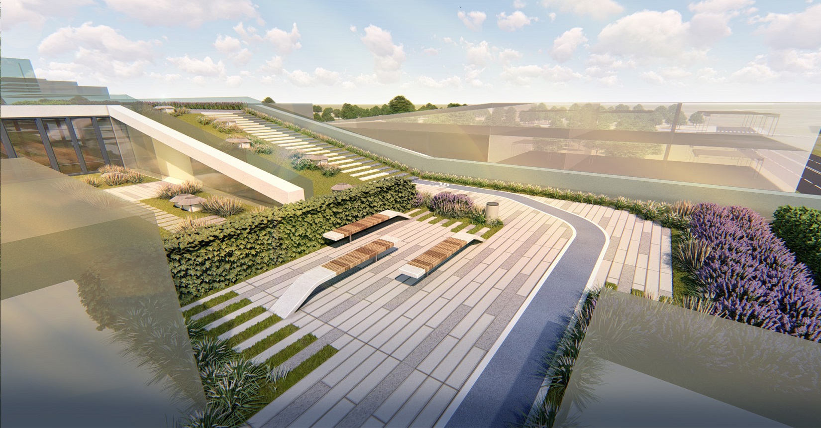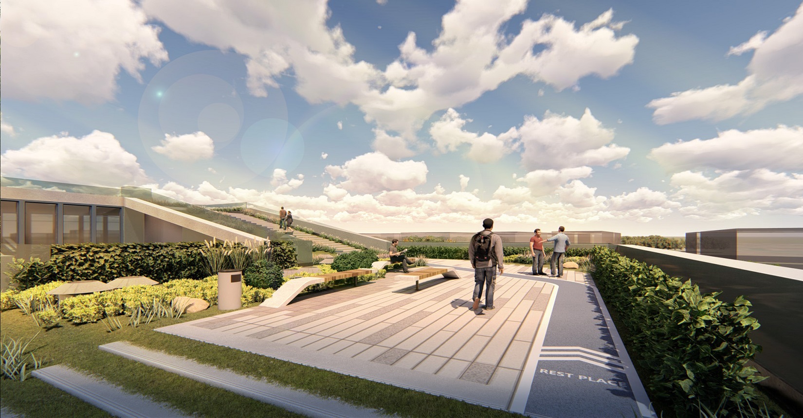 強調室內空間和室外空間的融合,利用屋面打造慢行系統,使建筑成為公園的組成部分,將公園景觀引入建筑當中,打造具有標志性的城市客廳、一個戶外生態(tài)客廳、原生態(tài)的生活空間,鼓勵面對面的交流,員工之間的交流,員工與客戶的交流,鄰里之間的交流。使用一條流動的能量線環(huán)形慢跑道,串聯整個空間傳達先進、高能量與流動的整體形象。